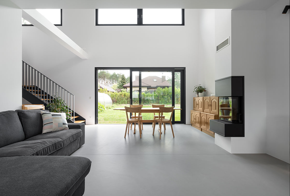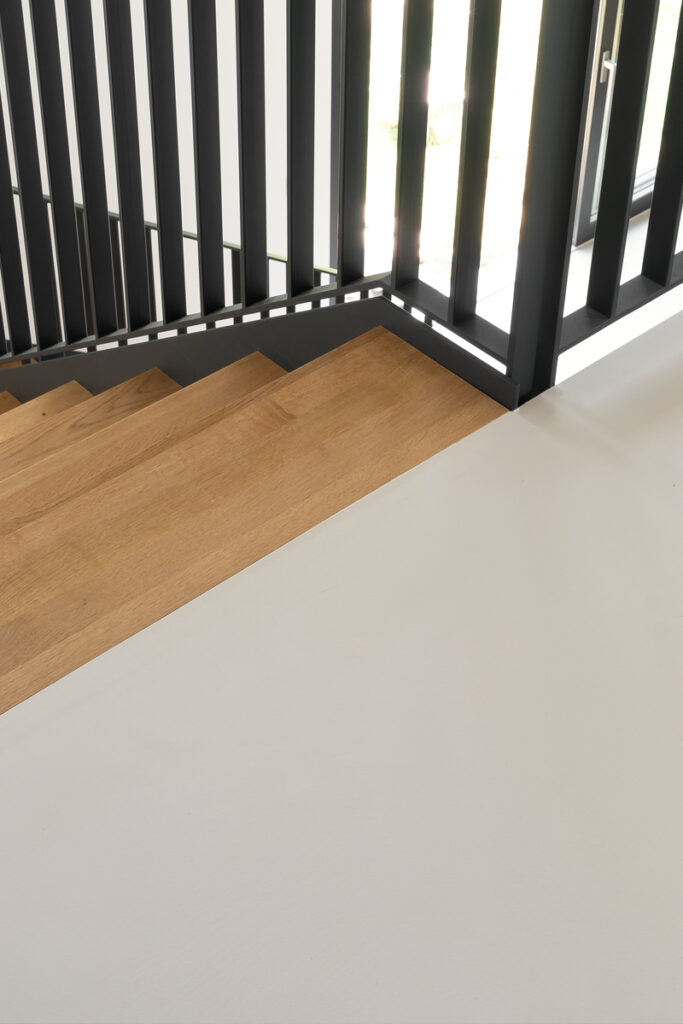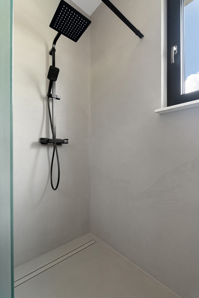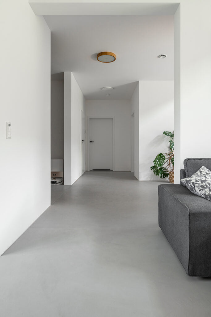 Microcement on the floor easily adapts to different interior styles, from modern to more traditional, so it is also ideal for bedrooms. In addition, it has good thermal conductivity, which makes it suitable for use on underfloor heating. This makes walking on such a surface pleasant for your feet, even when it’s winter outside the window. This is especially important when getting out of bed and placing bare feet on the floor, ensuring comfort from the start of the morning. The use of microcement on the bedroom floor has many advantages, which is why it is an increasingly popular solution in interior design, including here. Beige flooring runs through the bedrooms, bathroom and mezzanine.