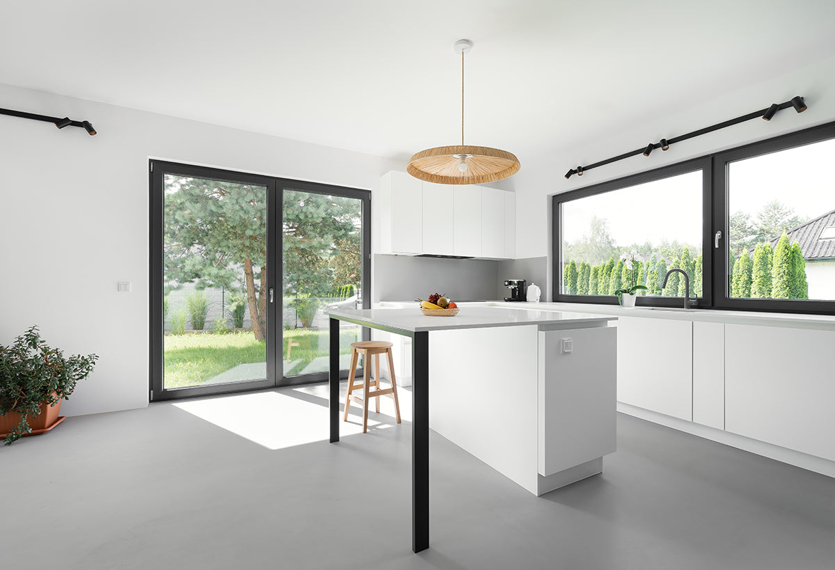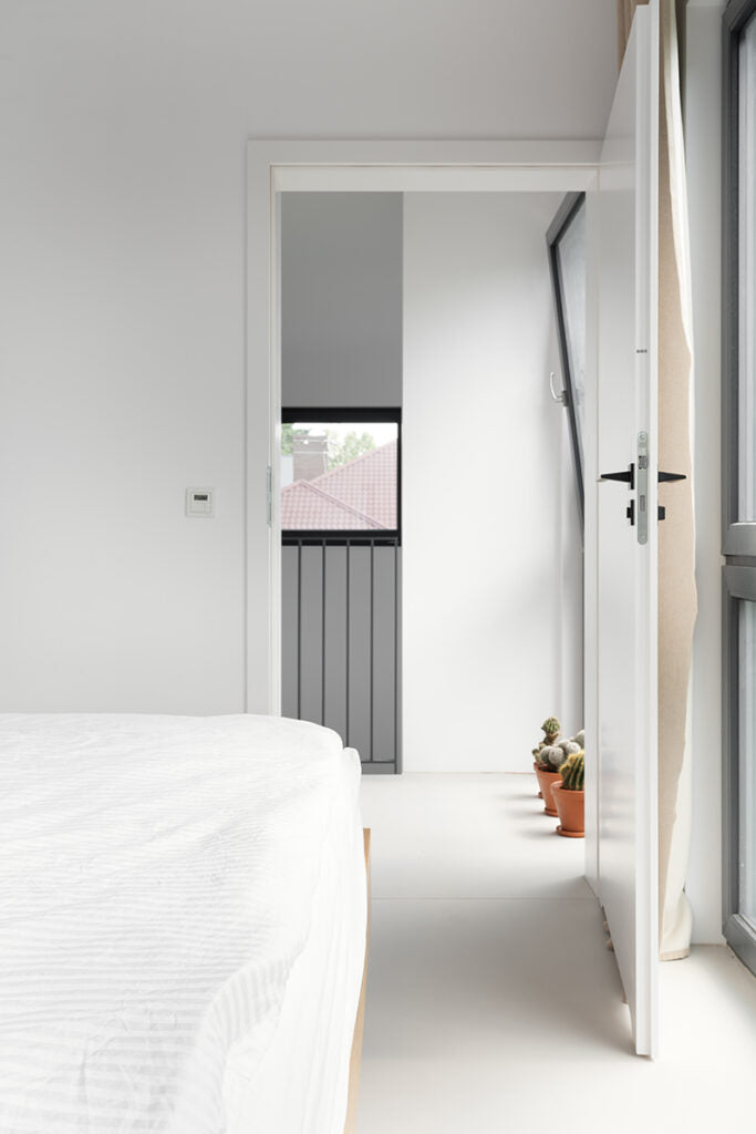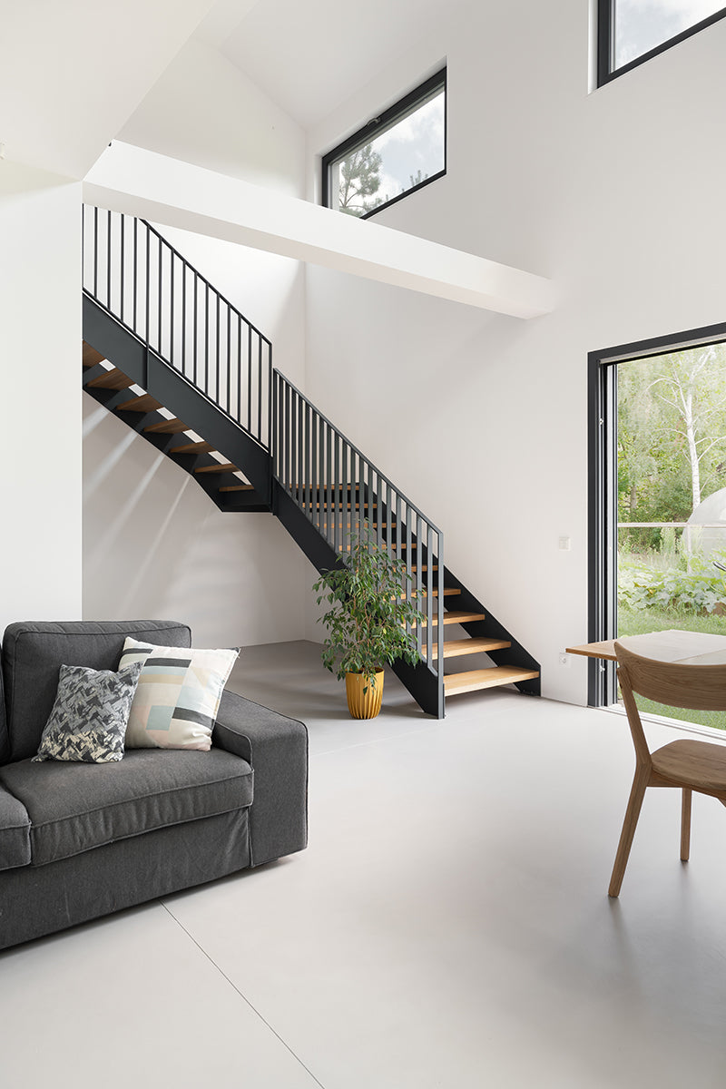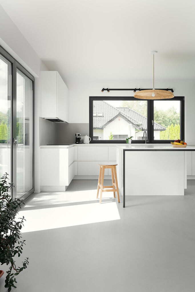 Microcement on the floor easily adapts to different interior styles, from modern to more traditional, so it is also ideal for bedrooms. In addition, it has good thermal conductivity, which makes it suitable for use on underfloor heating. This makes walking on such a surface pleasant for your feet, even when it’s winter outside the window. This is especially important when getting out of bed and placing bare feet on the floor, ensuring comfort from the start of the morning. The use of microcement on the bedroom floor has many advantages, which is why it is an increasingly popular solution in interior design, including here. Beige flooring runs through the bedrooms, bathroom and mezzanine.