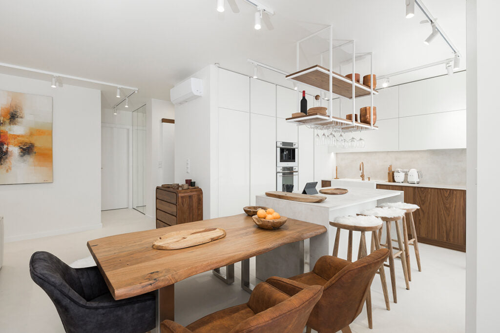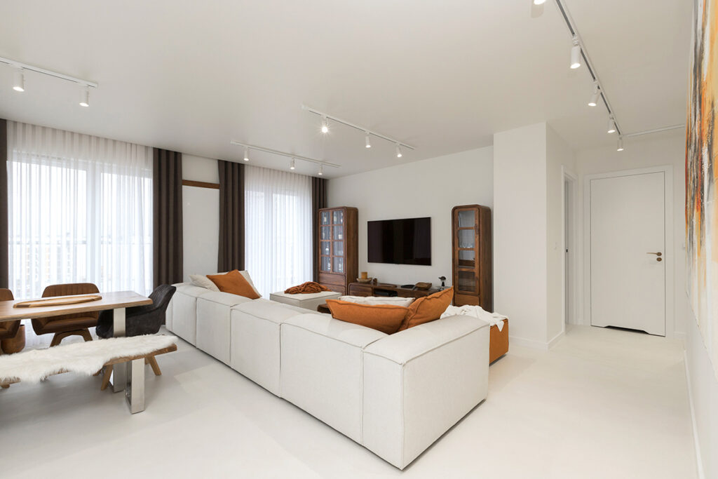 Every home must also not lack a bedroom – a place where we rest and regenerate our strength. That is why it is so important that it is decorated in a way that promotes our comfort and relaxation. In this bedroom, everything has been perfectly composed so that it is a coherent part of the whole house. The elegant white bed that is the focal point of the room, set on a sleek microcement floor, evokes an immediate desire to relax, like in a luxury hotel. Stylish furnishings, such as the abstract painting kept in muted colours, solid wood furniture with rounded shapes and heavy brown curtains, add intimacy and privacy to the room. Delicate openwork and wicker lamps give the interior a pleasantly warm and atmospheric feel. All this adds up to an ideal place for relaxation and regeneration.
