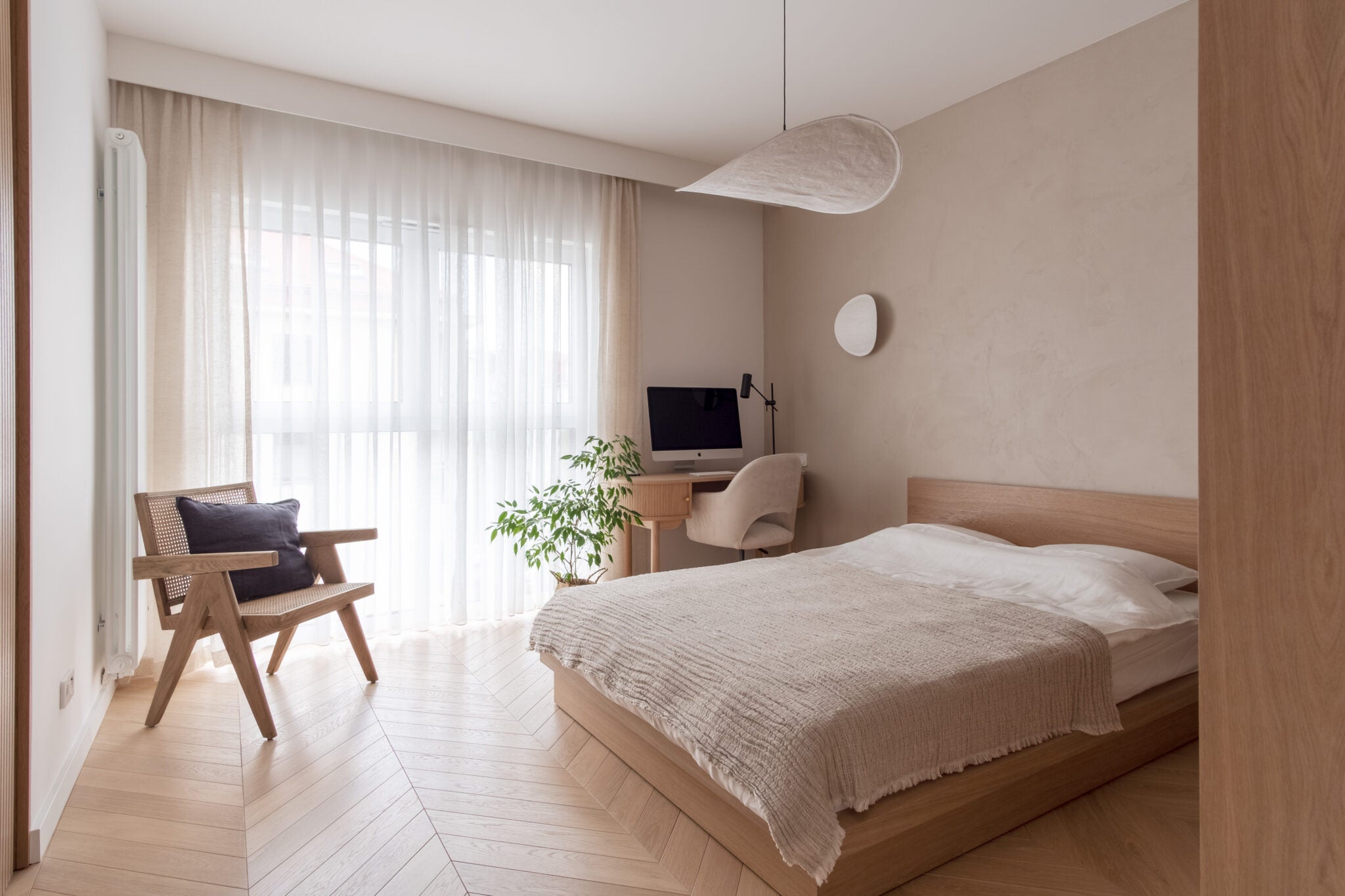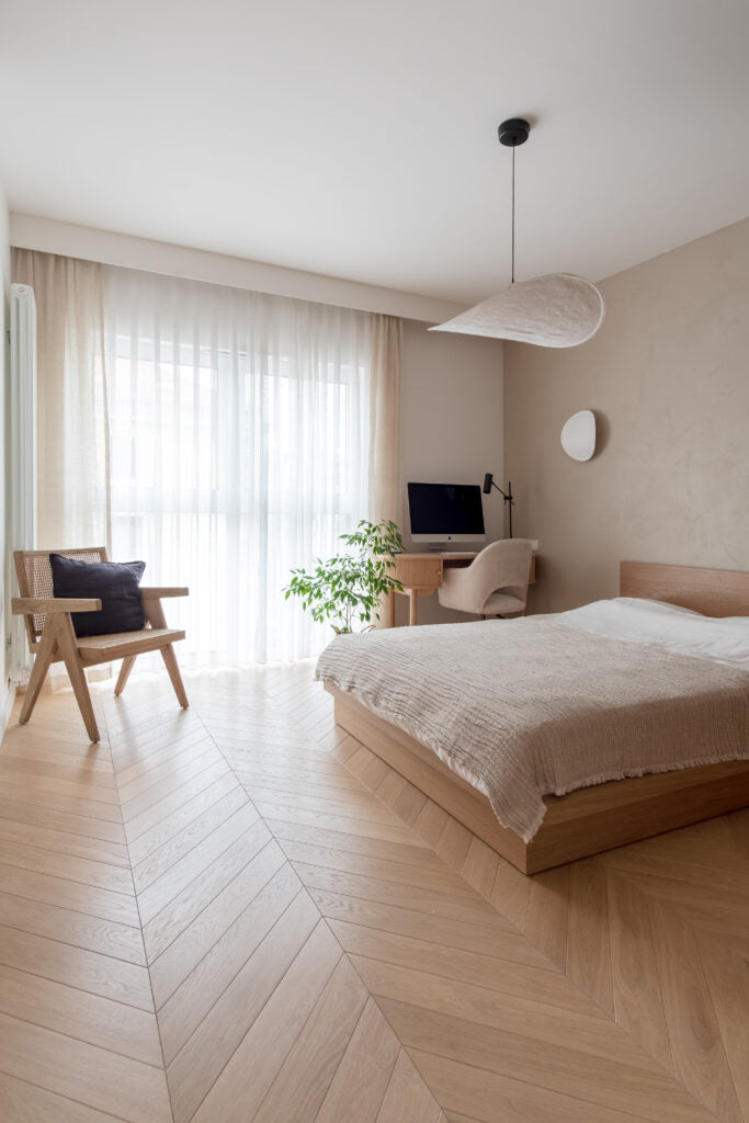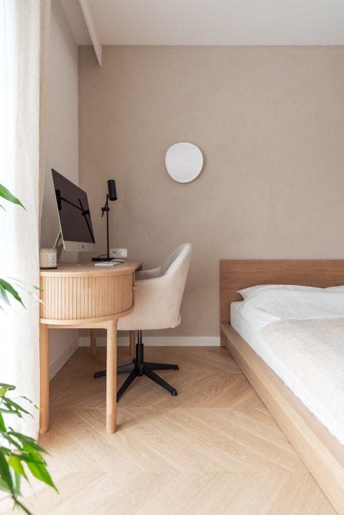 “It is set off by a bright lamp and a simple bed headboard,” she adds. “Thanks to the abrasion effect, which is one of several options for applying this material, the wall has become a painterly background and a complement to the entire interior.”