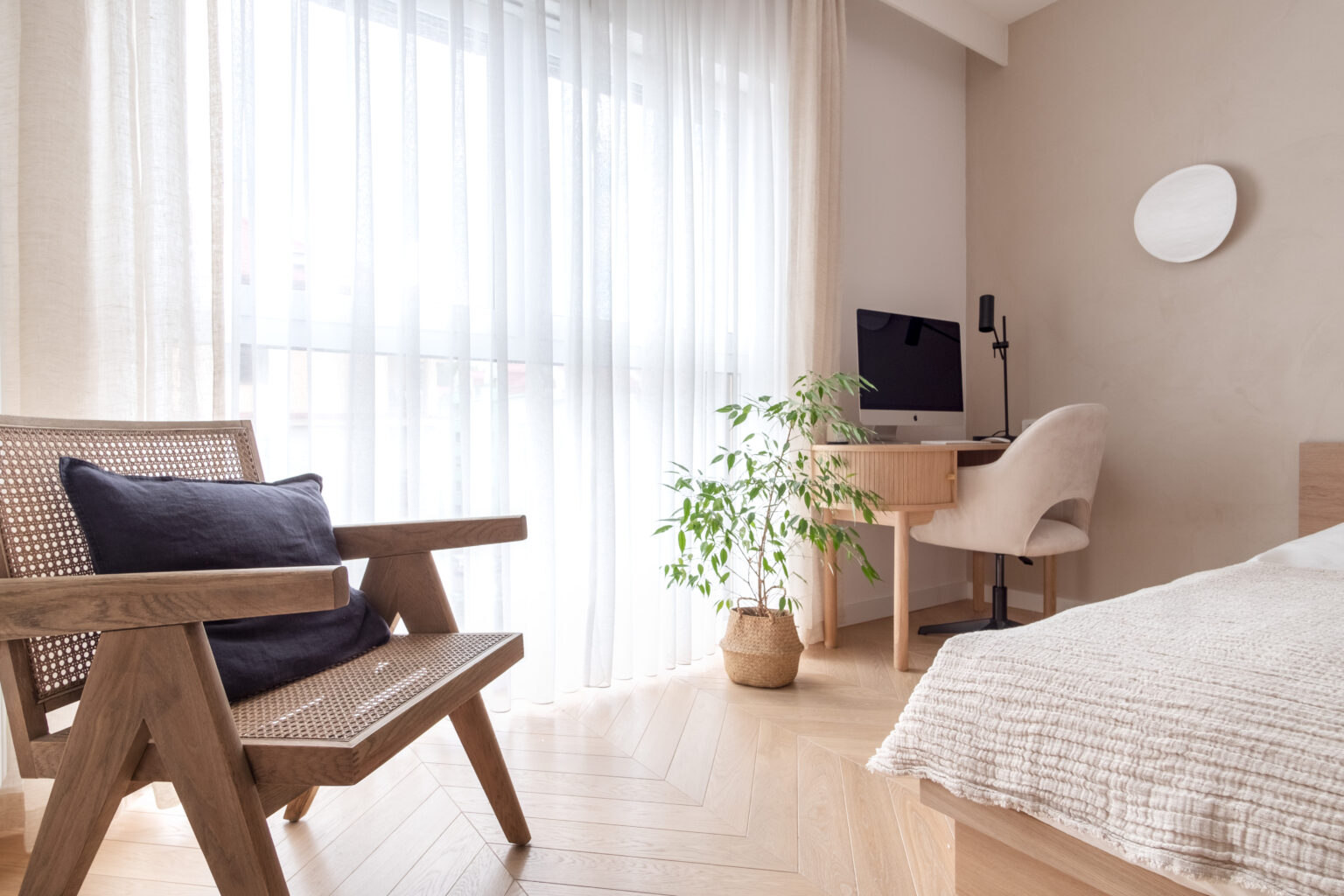“The materials used to finish this space include natural oak on the floor and furniture, and wall finish, with a beautiful microcement-covered wall taking centre stage.”