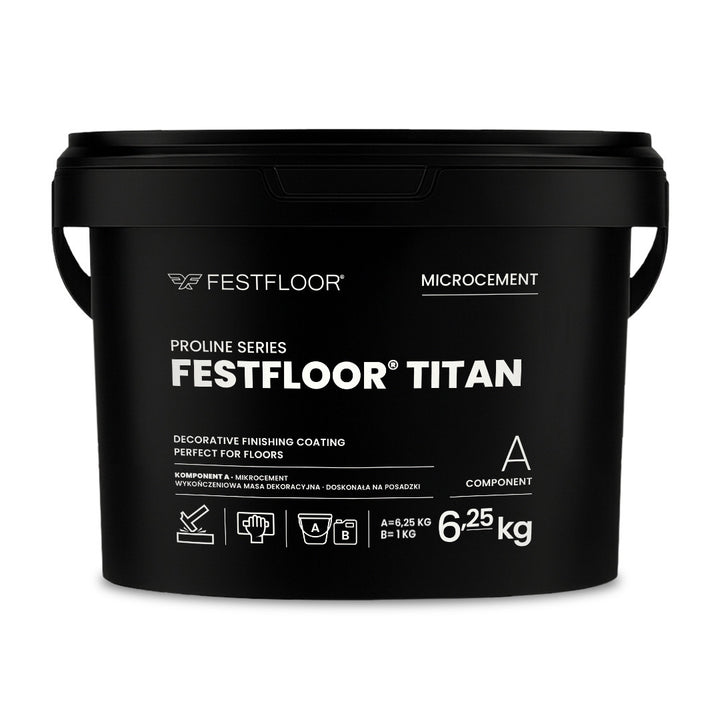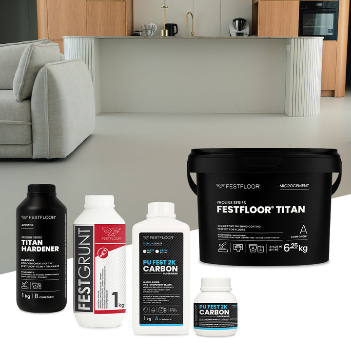 Das Festfloor Titan Set für 10 m² Boden ist ein komplettes Produktpaket zur Herstellung eines besonders harten und langlebigen Bodens aus Festfloor Titan Mikrozement.